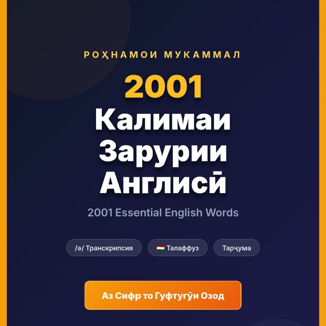 This book is an essential asset for every English learner. It features 2001 of the most frequently used words that form the foundation of daily conversation. Each entry includes international phonetic transcription (IPA), a user-friendly pronunciation guide in Tajik, and an accurate translation.
